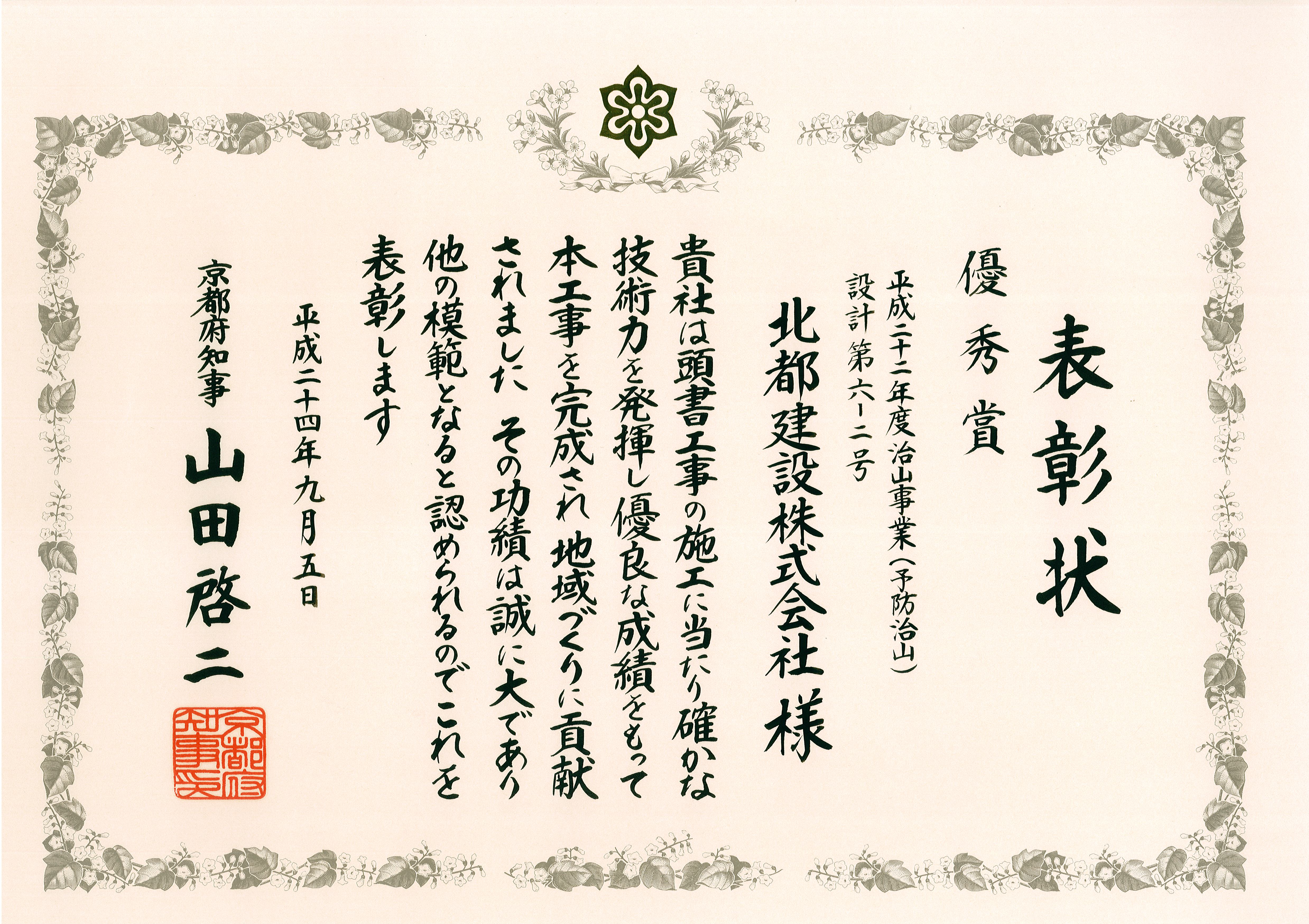 この現場では努力の結果が実り、京都府地域づくり優良工事施工者表彰で